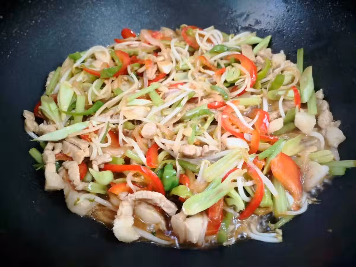 8、加入拌過油的麵條,大火翻炒均勻,可以用筷子挑散,再加入一勺生抽,半勺老抽,適量的鹽,孜然粉,雞精,翻炒均勻後出鍋裝盤。這樣一份簡單易學,好吃解饞的家常炒麵就做好了。