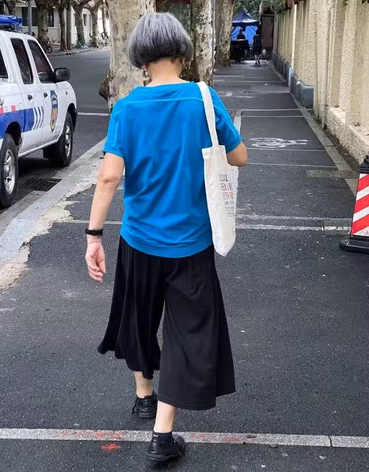 真正有品位、會打扮的老年女性,很少會穿「老年裝」,更多的是選擇「無齡基礎款」。像這種基礎款T恤,想要提亮膚色又顯年輕,可以選擇色彩飽和度較高的顏色,比如克萊因藍就很顯膚白。下半身搭配黑色喇叭褲,掩飾腿型缺陷的同時也能起到更好的塑形效果,整體造型搭配和配色簡約又減齡。