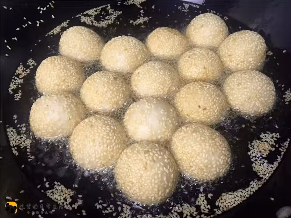 4.鍋底放入油,油溫6成熱,放入麻球,一直小火炸,直到炸成金黃色即可起鍋。
