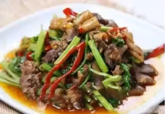 7.加點料酒翻炒一會,下入芹菜炒斷生