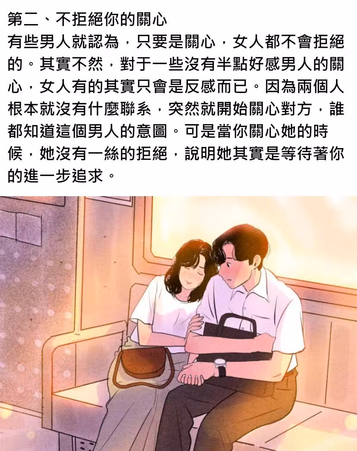 有些男人就認為,只要是關心,女人都不會拒絕的。其實不然,對於一些沒有半點好感男人的關心,女人有的其實只會是反感而已。因為兩個人根本就沒有什麼聯系,突然就開始心對方,誰都知道這個男人的意圖。可是當你關心她的時候,她沒有一絲的拒絕,說明她其實是等待著你的進一步追求。