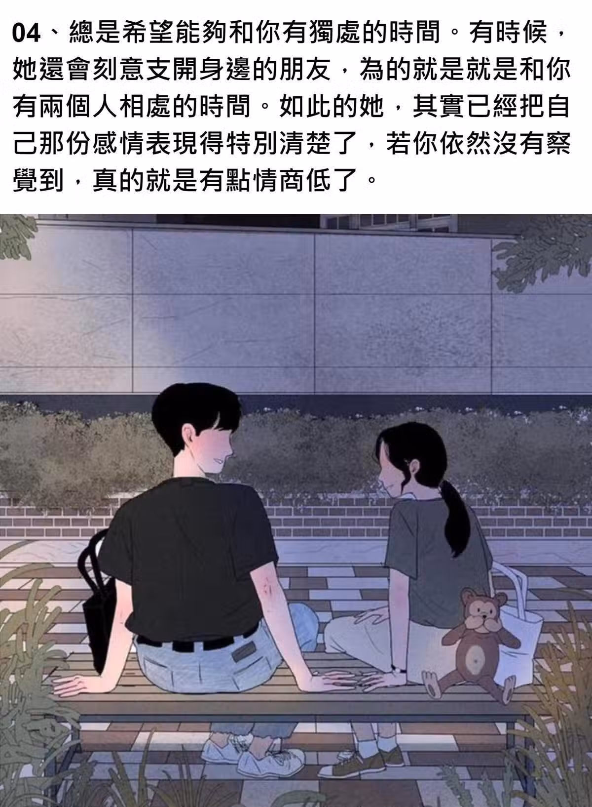04、總是希望能夠和你有獨虛的時間。有時候,她還會刻意支開身邊的朋友,為的就是就是和你有兩個人相處的時間。如此的她,其實已經把自己那份感情表現得特別清楚了,若你依然沒有察覺到,真的就是有點情商低了。