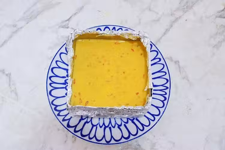 10、將芒果慕斯蛋糕放入冰箱中冷藏24小時,等待慕斯蛋糕凝固成型即可,脫模的時候可以用吹風機吹一下,將蛋糕脫模即可食用。