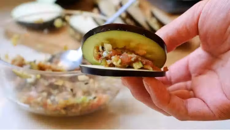 6、每一個茄盒都重複此步驟,上下兩個茄片夾雜著肉餡。