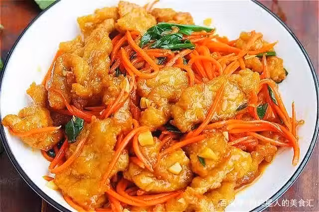 步驟4.鍋里留底油,爆香蒜末,下胡蘿蔔絲炒熟,再加入炸熟的肉片,然後倒入調好的醬汁和蔥段,翻炒均勻,直到收汁即可。