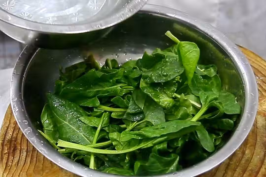 2、鍋里燒水,加入一勺食鹽,一勺植物油,水開後倒入菠菜,焯水40秒去除草酸,然後撈出、用水沖洗沖涼。