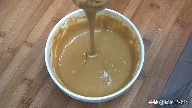 6、攪拌好是這樣的狀態,打蛋器拿起來麵糊能緩慢流下來。每家的麵粉吸水量不同,如果最後太稀了就加些麵粉,太硬了就加點水或者牛奶。