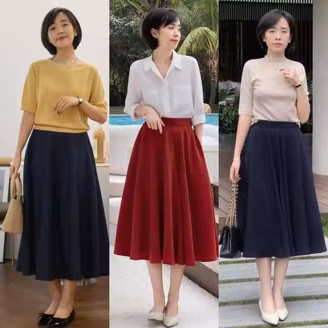 A字裙的輪廓在視覺上延伸了身體線條。對於微胖的女生來說,正好遮住腿部最性感的部分。對於身材嬌小的女生來說,還有拉長腿部的效果。搭配奶奶鞋,剛好露出腳背的肌膚,將腿部線條延伸至腳趾,顯得顯高顯瘦,也為穿搭增加了輕盈感。