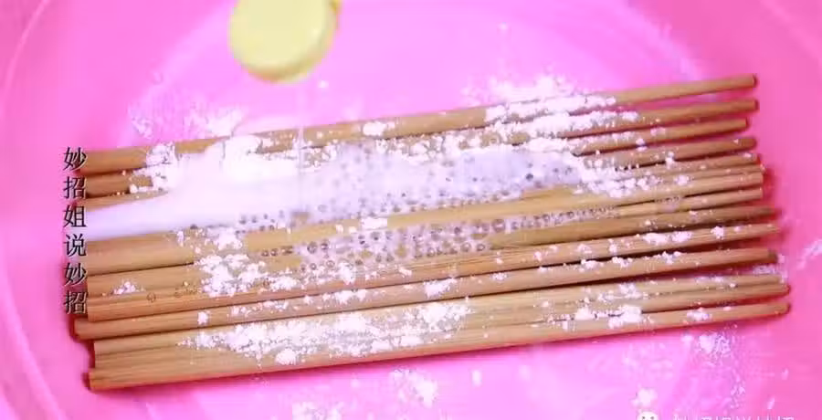 接著,我們再往盆裡面倒入剛燒好的開水,用開水把筷子燙一燙,開水也能起到一個消毒的作用。