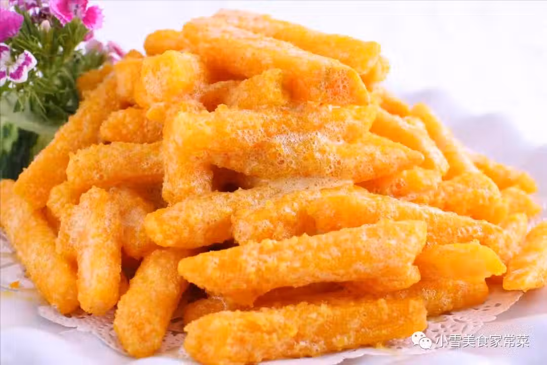 2.熱鍋加入黃油,小火將黃油熬化,放入鹹蛋黃,小火翻炒,炒至鹹蛋黃成泡沫狀,將南瓜條放入鍋中,快速翻炒,使南瓜條上均勻的裹上一層蛋黃即可。