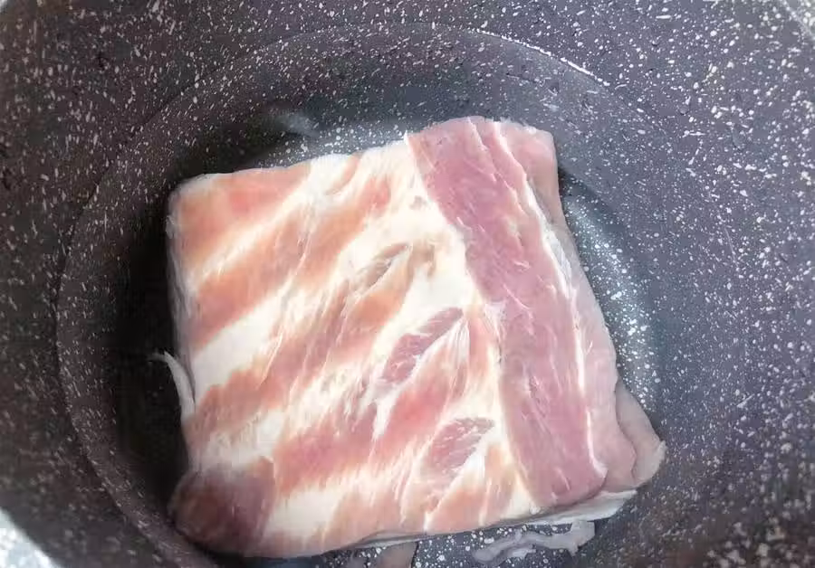 2、五花肉煮好以後,先用叉子或牙簽在肉皮表面扎若干個小洞,最後再在肉皮表面塗抹適量鹽和適量白醋,腌制15分鐘。
