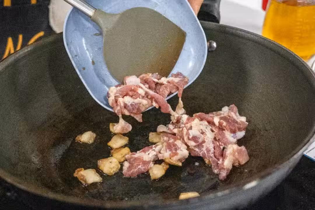 2、起鍋燒油,將肉下鍋輕微煸炒出豬油,然後撒上較多食鹽拌一拌。