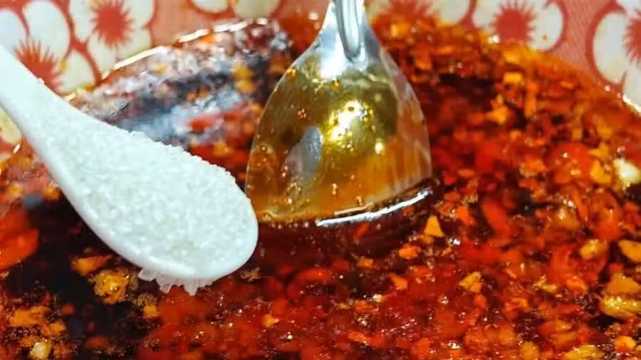 3、用勺子攪拌均勻之後,再往裡加入一勺生抽醬油、一勺蠔油以及一勺白糖進行增鮮提味,再用勺子繼續攪拌攪拌,這樣一碗靈魂調味汁就大功告成了。