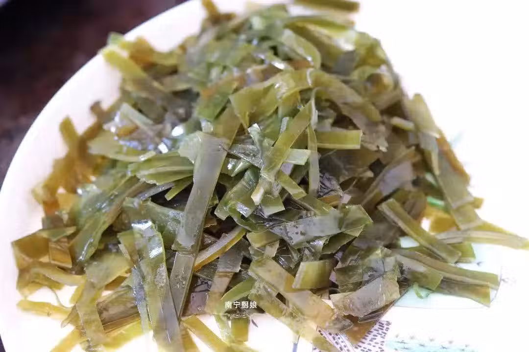 3、把煮好的海帶放在冷水裡降溫,然後再拿出來切成海帶絲的樣子。