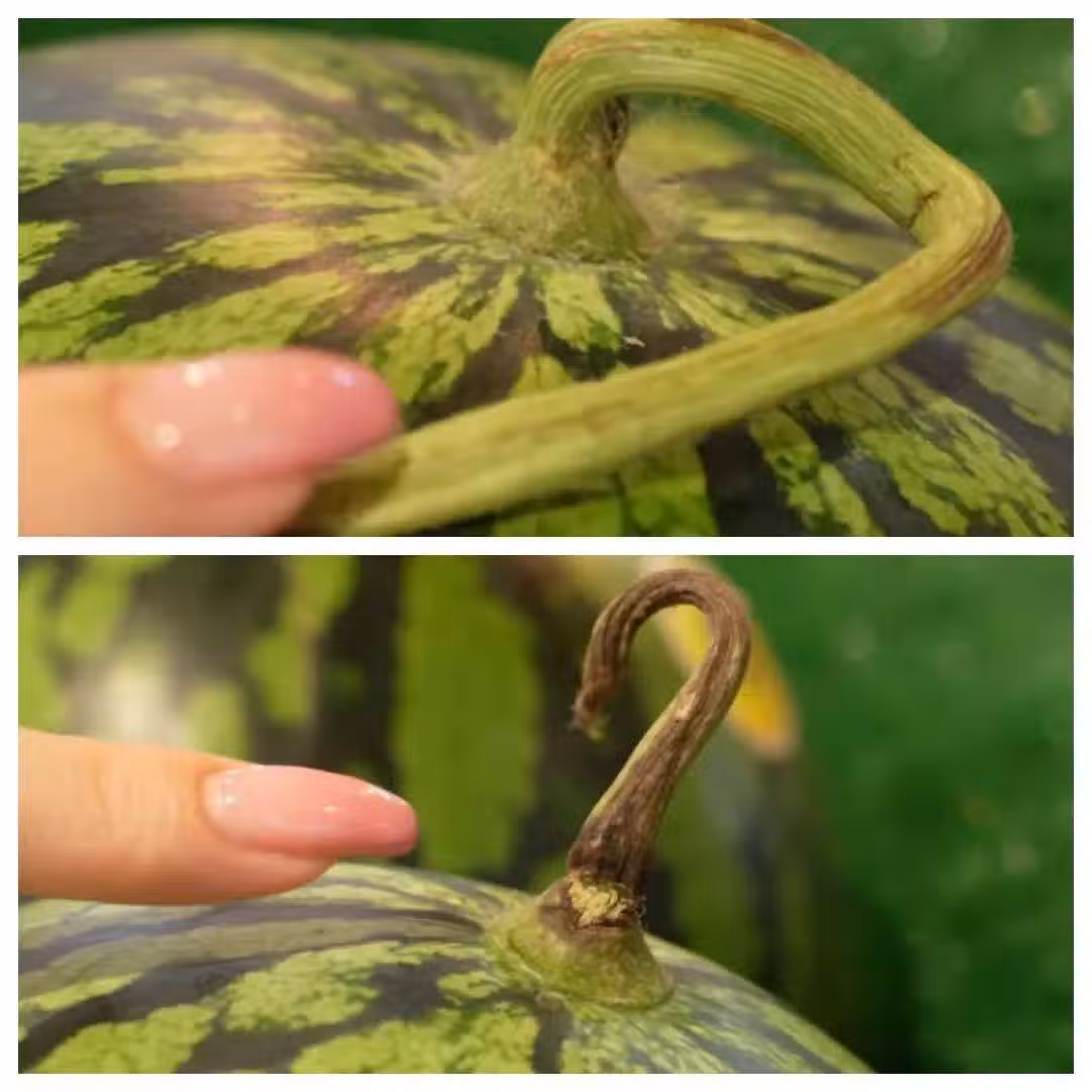 如果看到西瓜沒有瓜藤或者顏色是枯黃的,不要選,那表示這個瓜沒成熟就被摘下來或者是不新鮮的西瓜。