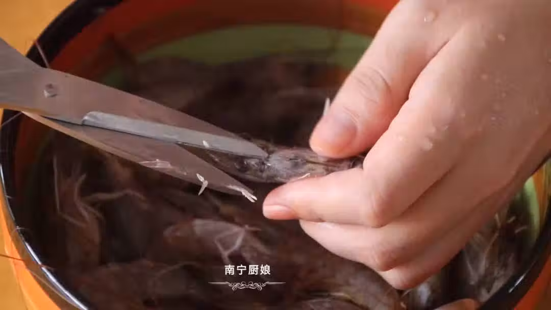 第二步:用剪刀剪掉蝦槍、蝦須。蝦線很臟,用剪刀在大蝦的頭部和身體之間開一個小口,將大蝦的黑線抽出。這樣不僅讓蝦肉更美觀,吃起來也更干凈衛生。