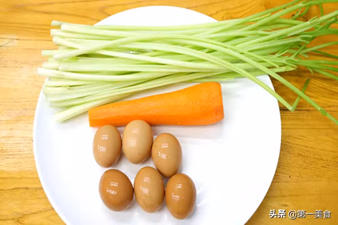 3.燒半鍋開水,淋入少許植物油保持鮮亮的色澤,防止營養流失,把芹菜和胡蘿蔔放入鍋中汆煮一下,這一步是為了方便後期快速炒熟、保持清脆的口感,煮至再次開鍋即可倒出來,迅速用涼水沖洗過涼。