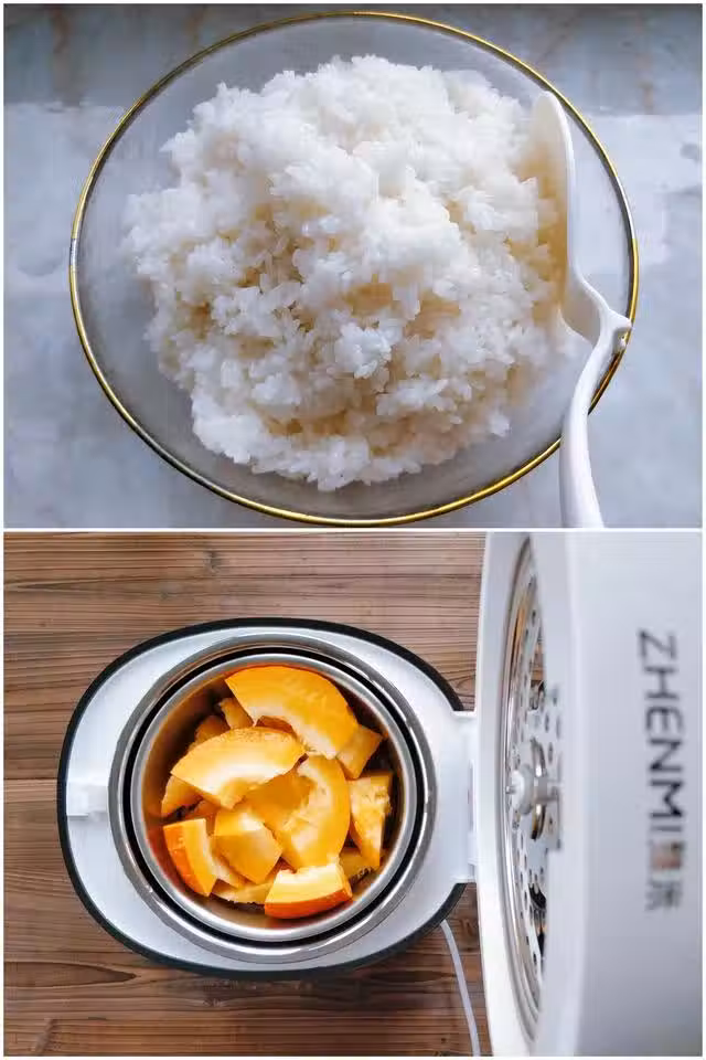 6. 再把南瓜洗凈,去除南瓜籽,切成大塊,放入臻米脫糖電飯煲內。選擇蒸菜功能,蒸25分鐘。如果做的量少,可以把南瓜和糯米飯一起放入其中蒸熟,更節省時間。
