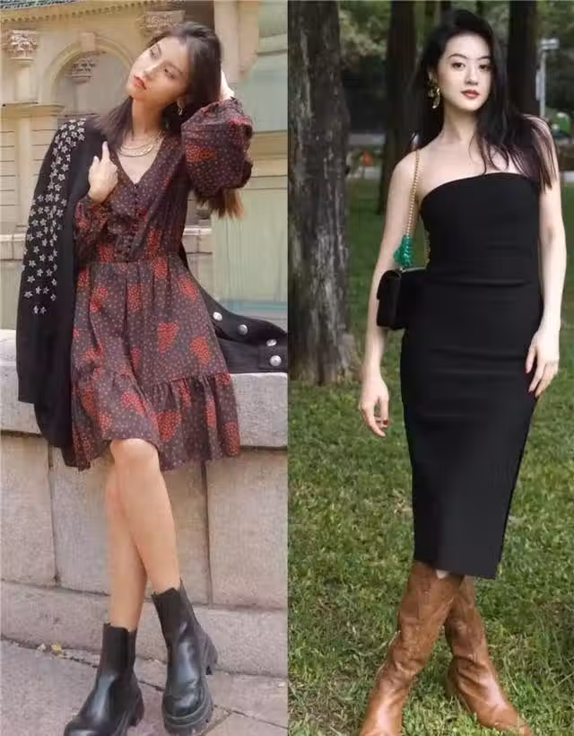 最近火了一種穿搭叫:連衣裙+裸靴,今年早秋這麼穿,洋氣又顯瘦