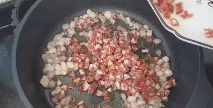第四步:臘腸炒香炒至變透明色,倒入香菇丁和蝦仁,繼續把它炒香,炒香後加料酒,生抽,適量的鹽,胡椒粉,繼續翻炒片刻,大概再炒1分鐘左右,把它們盛出備用,把油瀝出留在鍋中哦。