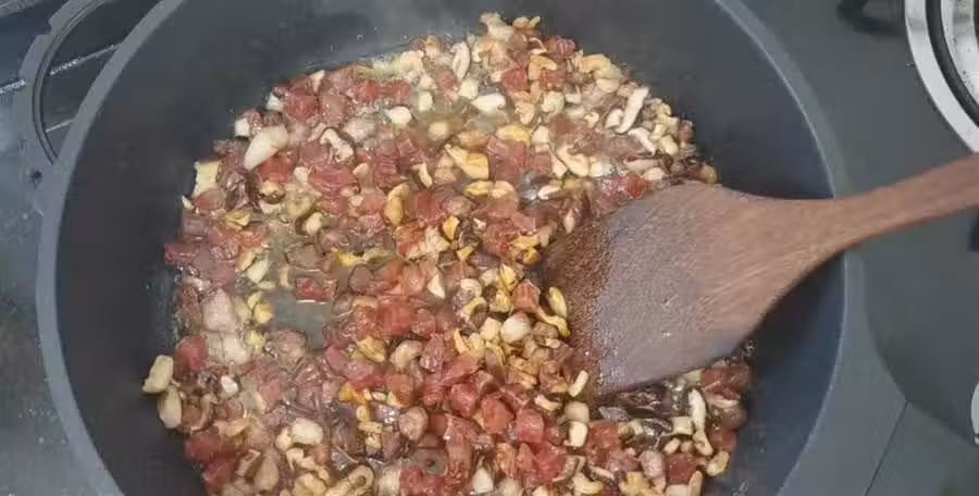 第六步:翻炒均勻後,重新倒入香菇臘腸丁,再次翻炒均勻,炒均勻後關火,放一邊放涼。