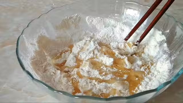 2、另一個小碗中加入100克麵粉,70克食用油。和成油酥。這個揉不成團,搓勻就可以了。