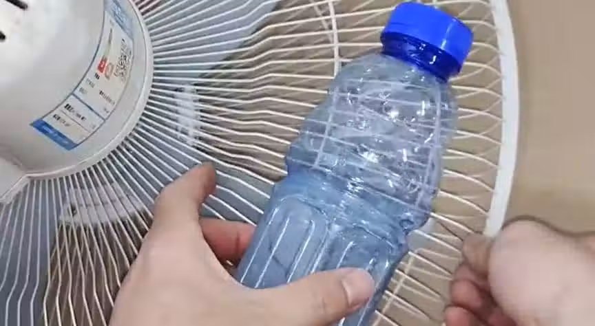 之後我們把這兩個瓶子綁在風扇上面,我們把這個有小孔的地方對準這個位置,之後把它綁在這個風扇它的一個背面,像這樣子把它綁好,我們可以綁兩個,三個,五個瓶子都可以,這樣子它的製冷效果會更好。