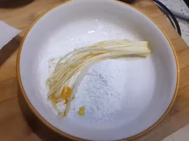 步驟四:鍋內倒油適量的油,6成熱時,下金針菇開始炸,最開始用筷子夾住金針菇,先把根部炸5秒鐘,定型之後再將整根金針菇浸入油鍋中,全程開中小火,將金針菇兩面炸至金黃即可出鍋。炸的過程中需時不時地翻動金針菇,以免糊鍋。