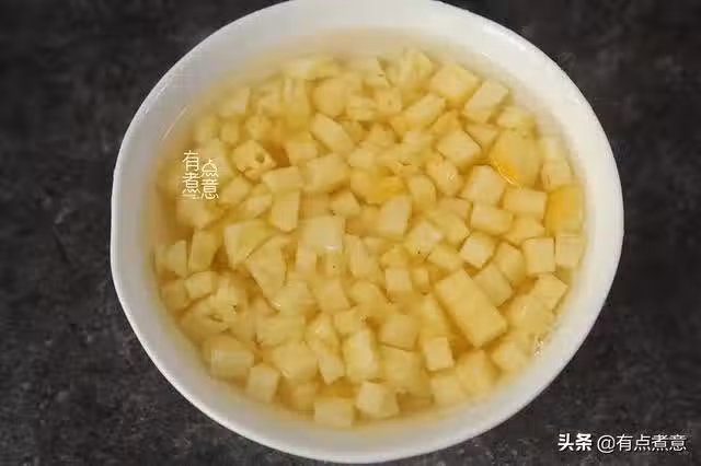 1、先把菠蘿肉切成指甲蓋大小的小方塊,然後倒入沒過菠蘿的清水,放入1茶匙鹽,浸泡著備用。(菠蘿一定要用鹽水浸泡過才能食用,因為菠蘿含有一種叫「菠蘿酶」的物質,會對口腔黏膜和嘴唇表皮產生刺激,還可能引起過敏,食鹽不但能抑制這種酶的活性,還能讓菠蘿的味道更甜。)