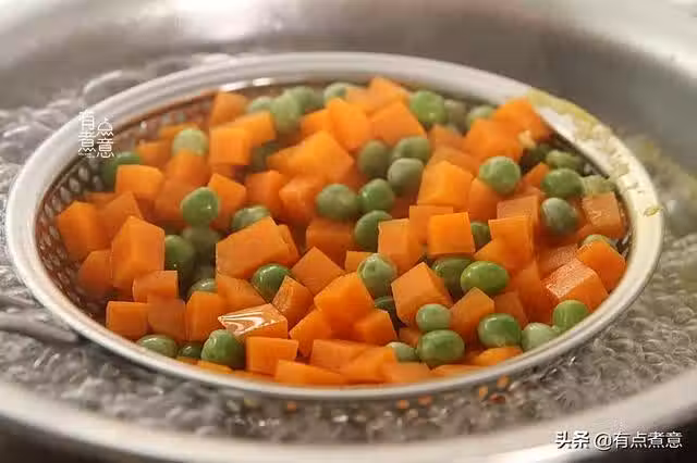 3、把胡蘿蔔去皮後切成小塊,鍋內燒開水,倒入胡蘿蔔和青豆煮2分鐘,然後撈起瀝干水。因為胡蘿蔔和青豆都是比較難熟的食材,所以最好提前焯水備用。