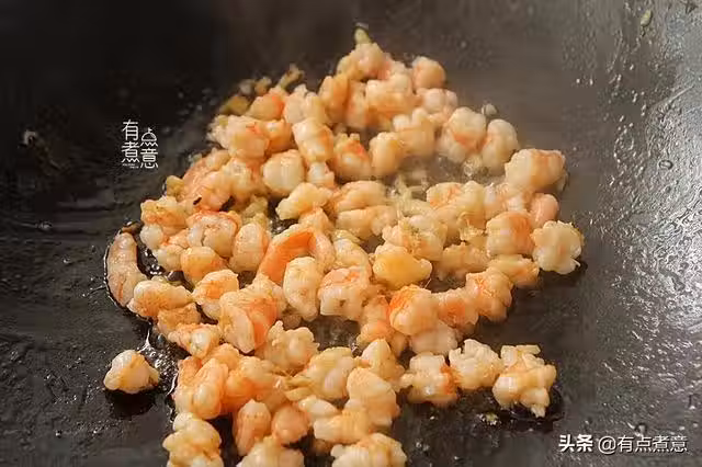 5、鍋內放入適量油,倒入薑蓉、蒜末炒香。然後倒入蝦仁炒至蝦仁變色,放入姜蒜可以使蝦仁更香,也可以去除腥味。蝦仁變色後裝起備用。