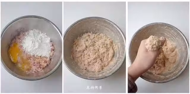 11.放入熱的油鍋里,並用無水的勺子慢慢推動一下,讓油帶動丸子轉動,這樣能保證丸子的形狀更圓。
