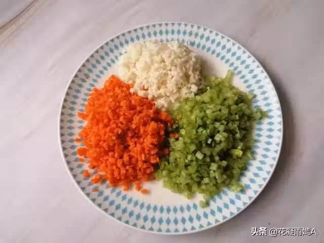 第二步:芹菜、胡蘿蔔、荸薺都切碎備用。