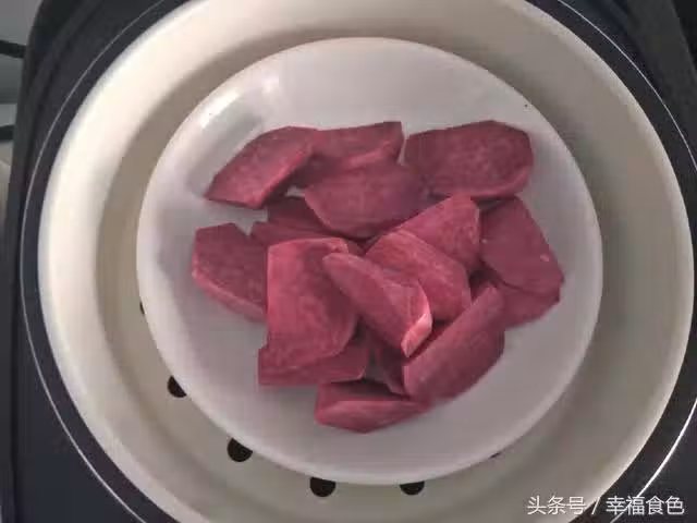 3、蒸好的紫薯用勺子壓成泥狀,然後放涼備用,放涼是為了更好的和酸奶一起混合,以免破壞酸奶裡面的益生菌。