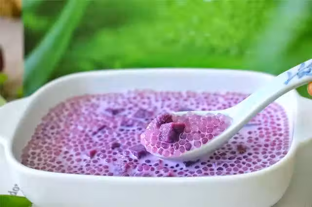【材料】:紫薯1個,西米適量,牛奶200克,蜂蜜適量