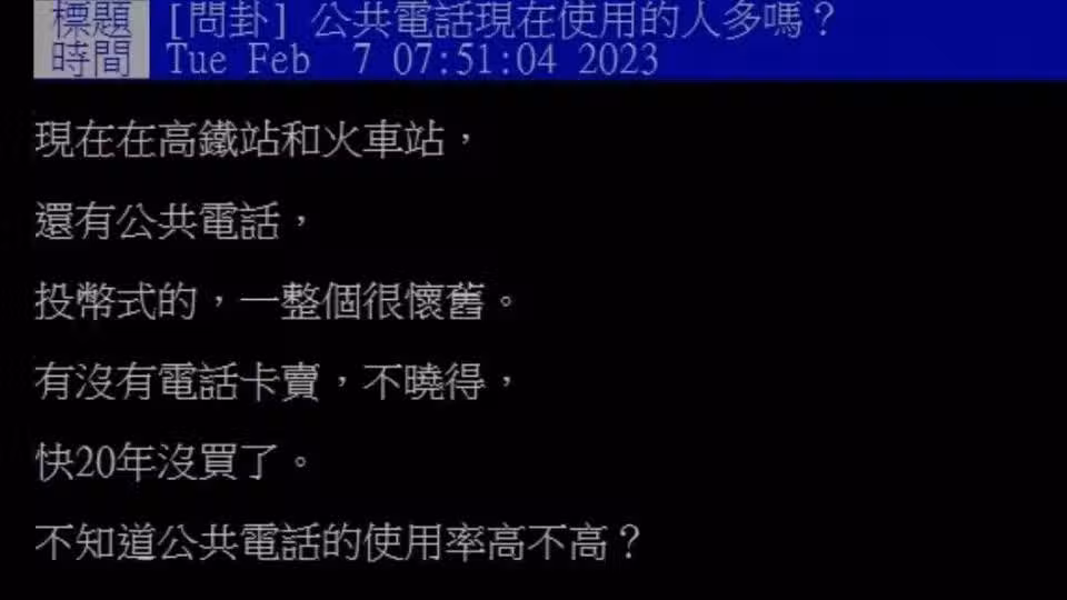 據《TVBS》報導,通訊設備進展快速,從前路上隨處可見的公共電話,到後來的BB. Call、黑金剛、大哥大,到現在的智慧型手機,許多通訊裝備慢慢被新的發明取代...不過近日一名網友在PTT提到,自己在區間車站和火車站,都還是有看見公共電話,而且都還是投幣式的,非常懷舊,也不曉得有沒有賣電話卡,不過自己是「快20年沒買了」,於是疑惑發問:「公共電話現在使用的人多嗎?」
