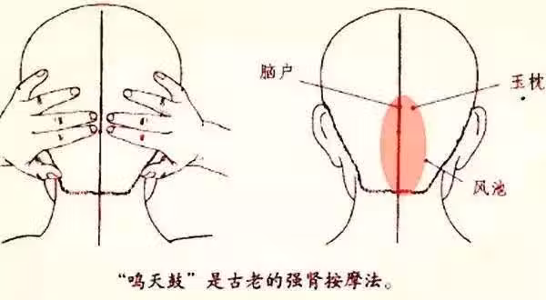雙手掌心緊按耳朵孔,中指和食指放在頭後枕部輕輕叩擊,使耳內隆隆如聞鼓聲,反復操作20-30次。