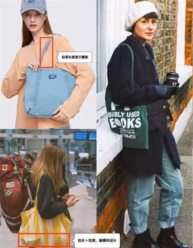 帆布包包帶高於腰部,視覺重心就會得到提高;選擇包長>包寬的橫向設計也能有效避免帆布包變拖沓,小個子也能放心背帆布包!