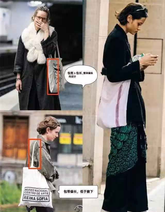 如果是高個子女生,法國女人則會利用 長款或大體積帆布包增強縱向延長感和搭配量感,讓身形更修長、氣場更突出。