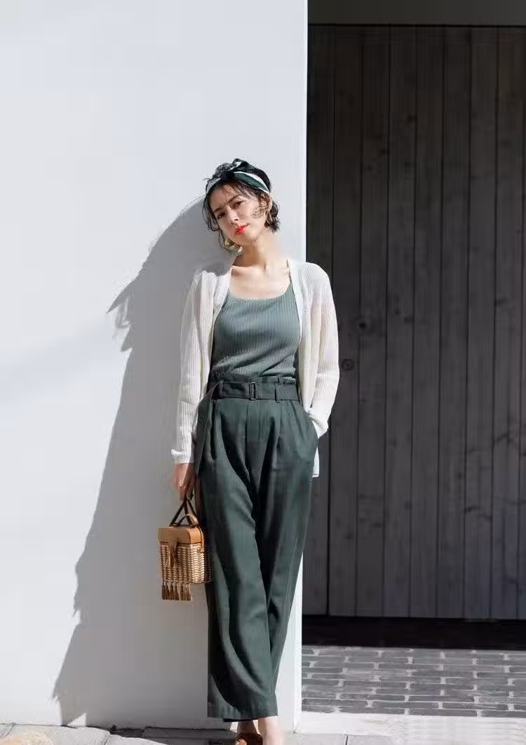 像這樣的基礎款開衫想要穿出時髦,必須給它來條時髦小夥伴,比如個性綠色高腰闊腿褲的加入,高腰闊腿褲很輕鬆地就能遮肉顯瘦,內搭同色系坑條紋的小吊帶,同樣起著顯瘦作用。白色+內搭綠色一體色,共同營造高級優雅穿搭。