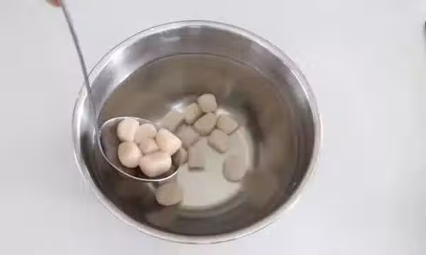 步驟12準備好西米,煮之前用水沖一下,然後用冰水泡著西米,讓它膨脹到原來體積的2~3倍,這樣做不會融掉。