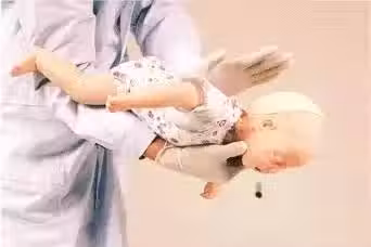 可以採取另外一個姿勢,把孩子翻過來,躺在堅硬的地面或床板上,搶救者跪下或立於其足側,或取坐位,並使患兒騎在搶救者的大腿上,面朝前。搶救者以兩手的中指或食指,放在患兒胸廓下和臍上的腹部,快速向上重擊壓迫,但要很輕柔。重復,直至異物排出。
