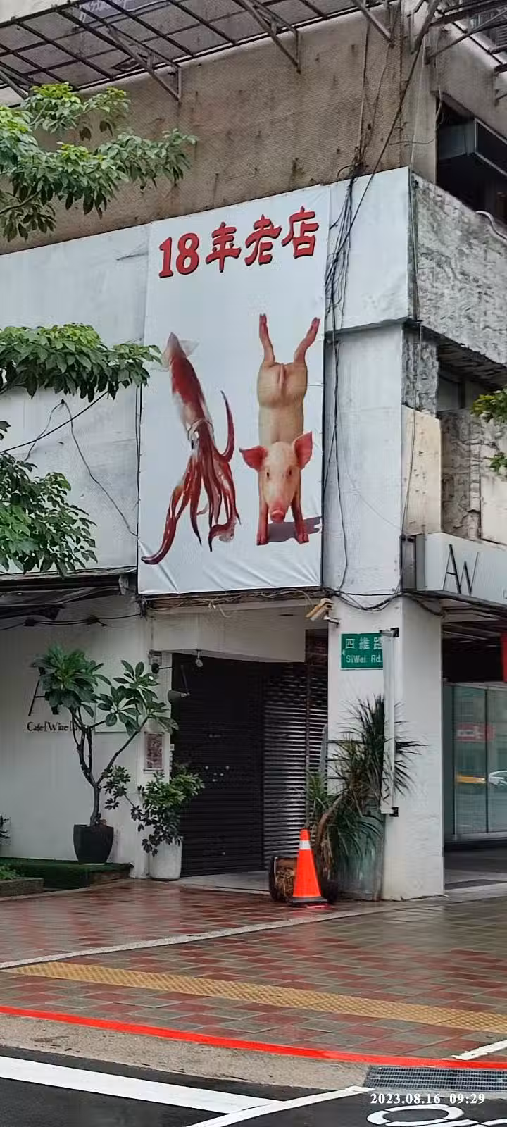 據《TVBS》報導,原PO在臉書社團「路上觀察學院」表示,途經台北市信義路和四維路口時,看到了一塊帆布招牌,不禁感到疑惑:「開車經過,這到底是賣什麼啦?」照片裡,大大的白色帆布寫著「18年老店」,並畫上寫實風的豬豬和魷魚,但奇怪的是,那隻豬卻是倒立姿勢?