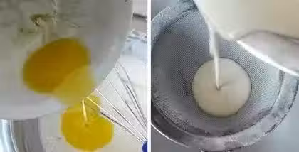 4、過篩後的麵糊非常細膩,放入冰箱冷藏30-40分鐘,冷藏後的麵糊更加濃稠,右圖是冷藏後的麵糊;如果馬上做,這一步可以忽略;