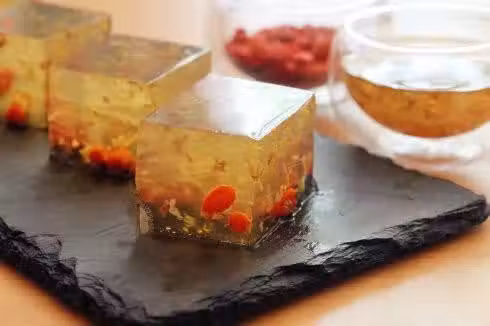 1、將冰糖倒入鍋中加水煮十分鐘直到完全融化;2、魚膠粉提前用85克水泡軟;3、拿一個玻璃杯,把枸杞倒入玻璃杯,加入適當的水浸泡,直至枸杞泡開;4、當冰糖完全融化後加入魚膠粉攪拌至融化,然後加入瀝干水的枸杞和桂花糖繼續攪拌均勻;5、將煮好的糖水隔冰水邊攪拌邊冷卻至略濃稠的狀態;6、攪拌20分鐘左右,把冷卻後的糖水倒入模具中送入冰箱冷藏直至完全凝固,將凝固的枸杞桂花糕脫模切塊即可食用。