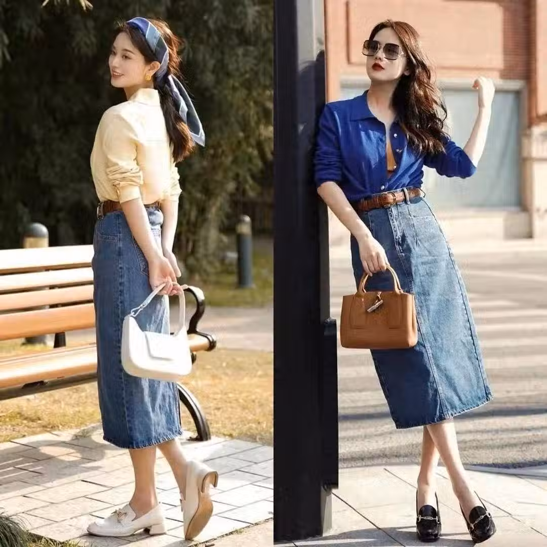 像下圖中的這種襯衫和牛仔裙的搭配就同時兼具了復古與知性的氣息,無論是搭配瑪麗珍鞋還是樂福鞋,都能營造出知性干練的風格。