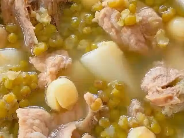3、將排骨、綠豆、蓮子、薑片放入鍋中,加入足量的清水,蓋上蓋子燉煮一個小時。接著再將山藥放進來燉煮二十分鐘。