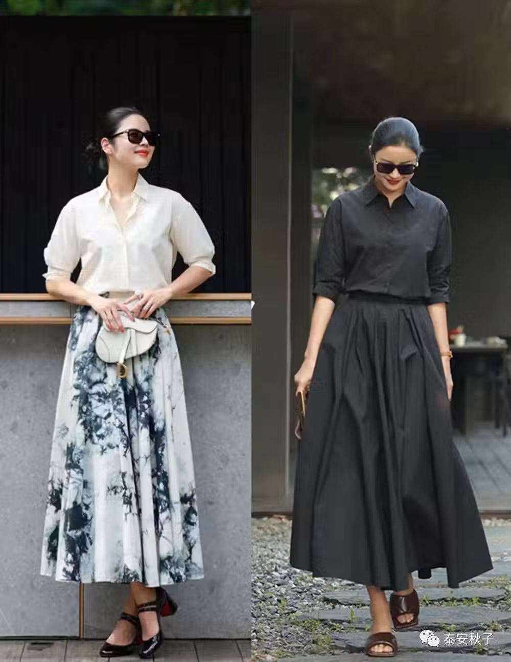 比如一條行走間靈動、飄逸感滿滿的中長款半身裙,便是被她們通過塞下擺或者腰帶等收腰方式,打造出張弛有度生動浪漫。
