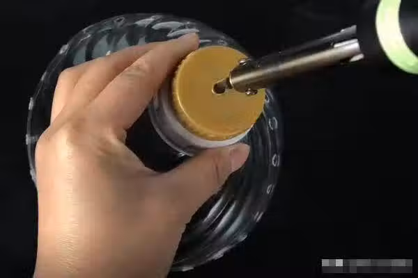 然後用電烙鐵頭在油桶的邊緣處均勻地戳一些小孔,再在瓶蓋頂部戳一個洞,再準備一個衣架把手,可以用老虎鉗剪下一個來,將衣架把手從瓶蓋上的洞穿過來就可以了