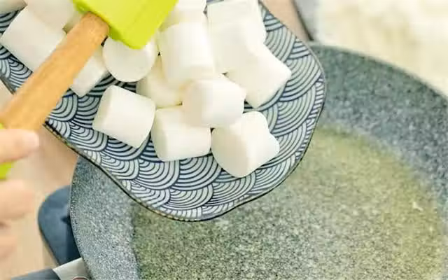 step5:看到棉花糖基本都融化了,就趕緊拌入奶粉,千萬別有耽擱。棉花糖如果熬太久會出現油水分離,導致失敗。
